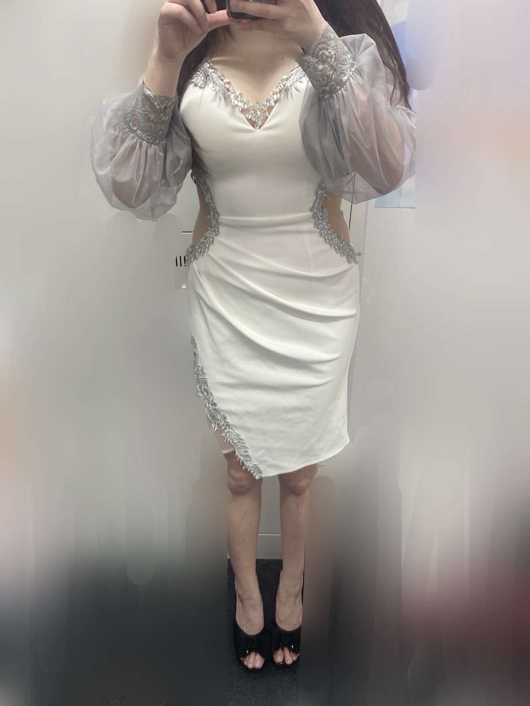 今日はドレスday🤍珍し目なものを着てみたので、鏡越しに📸😆 袖も腰もシースルーだよ🎶
